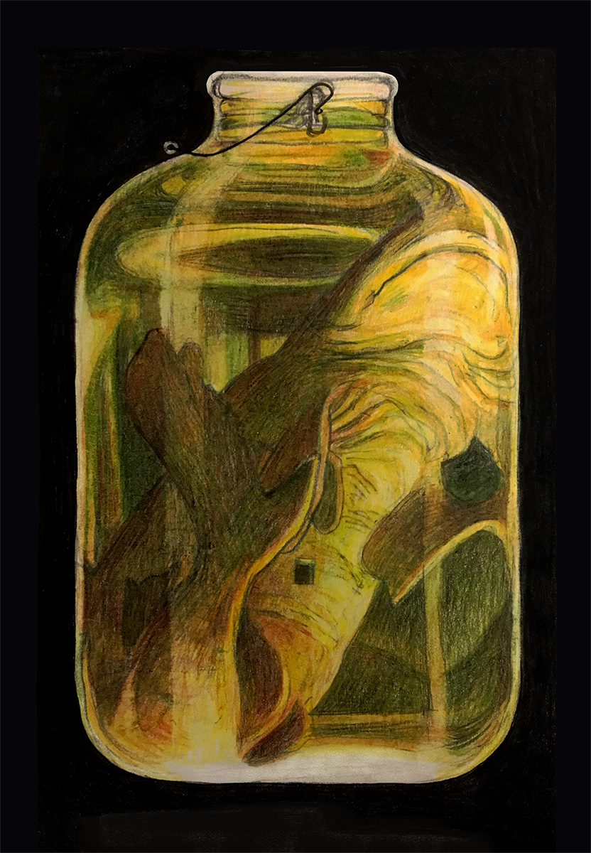 "Nurse Log," an illustration depicting the hostility and gluttony present in fungal feeding grounds, colored pencil, water color, ink on paper