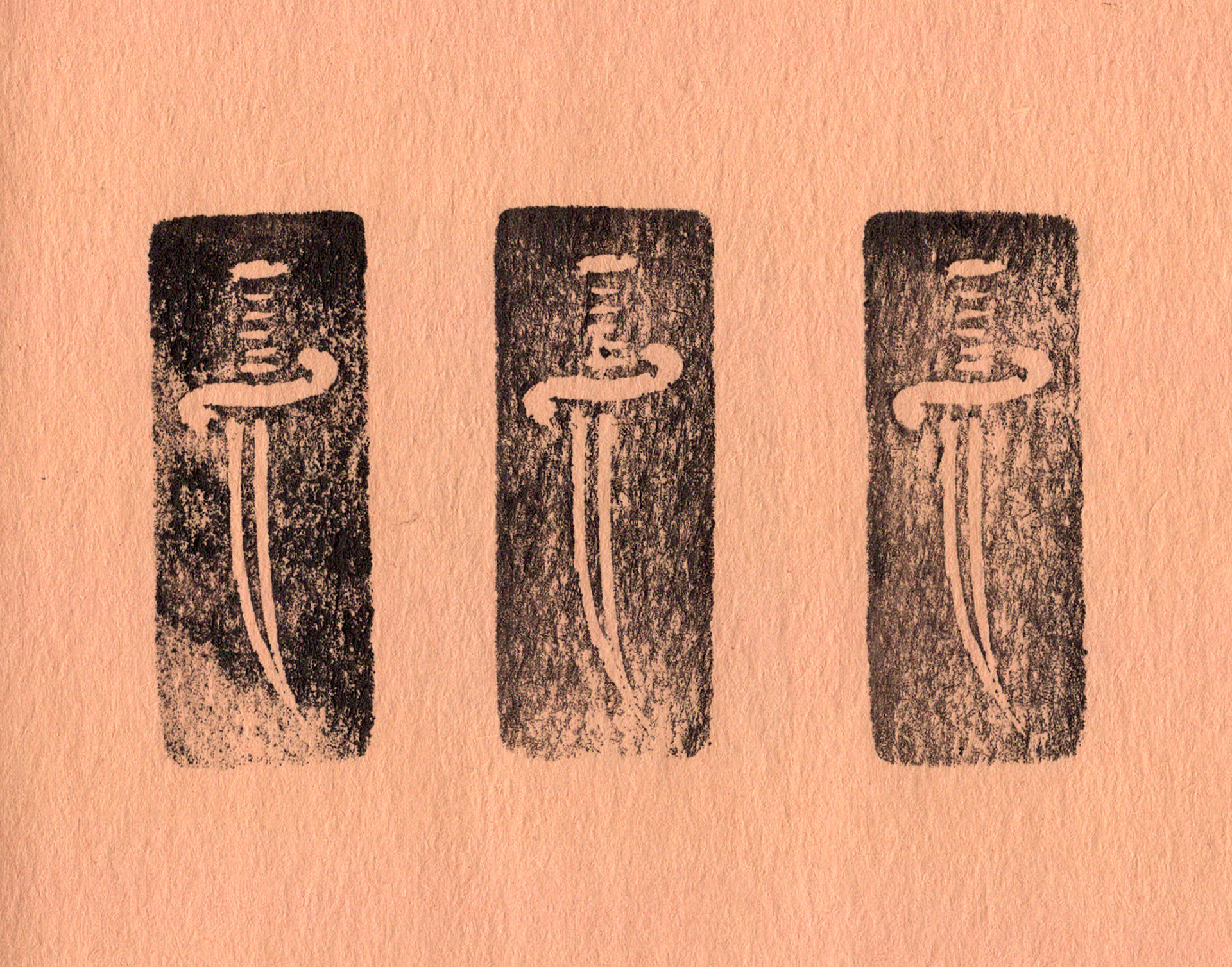 left: carved linoleum scrap stamp, right: carved in a pink eraser stamp, both: on construction paper