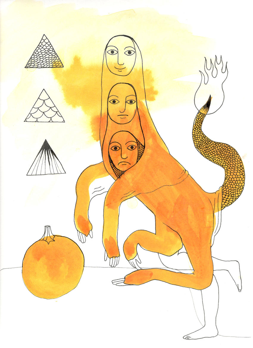 "Myc. Mediator," a character that acts as the ambassador between a fungal community and the trees they trade with, colored pencil, watercolor, and ink on paper